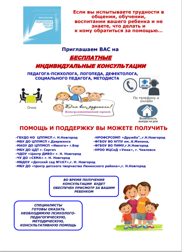 Список организаций Нижегородской области по оказанию бесплатных услуг психолого-педагогической, методической и консультативной помощи родителям (законным представителям) квалифицированными специалистами организаций в рамках федерального проекта "Современная школа" национального проекта "Образование"